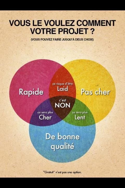 En ergonomie (qui n’est pas juste du confort…), si tu veux rapide, pas cher, et que ça atterrit à ne pas être de bonne qualité… ça sera pas juste moche; ça peut être suffisant pour que des gens souffrent, de maladies professionnelles, de risques psychosociaux… voire dans d’autres domaines, carrément du risque industriel, mais je ne suis quasiment pas intervenue dans ce type de cas. Les erreurs coûtent cher, mais notre représentation du risque d’erreur ou de manque n’est pas la même que celle du client, qui voit rarement l’ensemble des conséquences (s’il les voyait tout seul, on n’aurait pas besoin d’être là!).